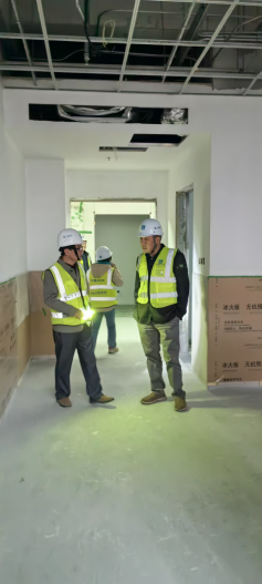 在施工現(xiàn)場,吳紹兵董事長與隨行人員仔細察看了墻面施工工藝,對醫(yī)療項目特種建材的應(yīng)用效果進行了細致考察。董事長對現(xiàn)場施工規(guī)范,安全措施落實到位給予了高度評價,充分肯定了馬總在項目管理上的高標(biāo)準與嚴要求。